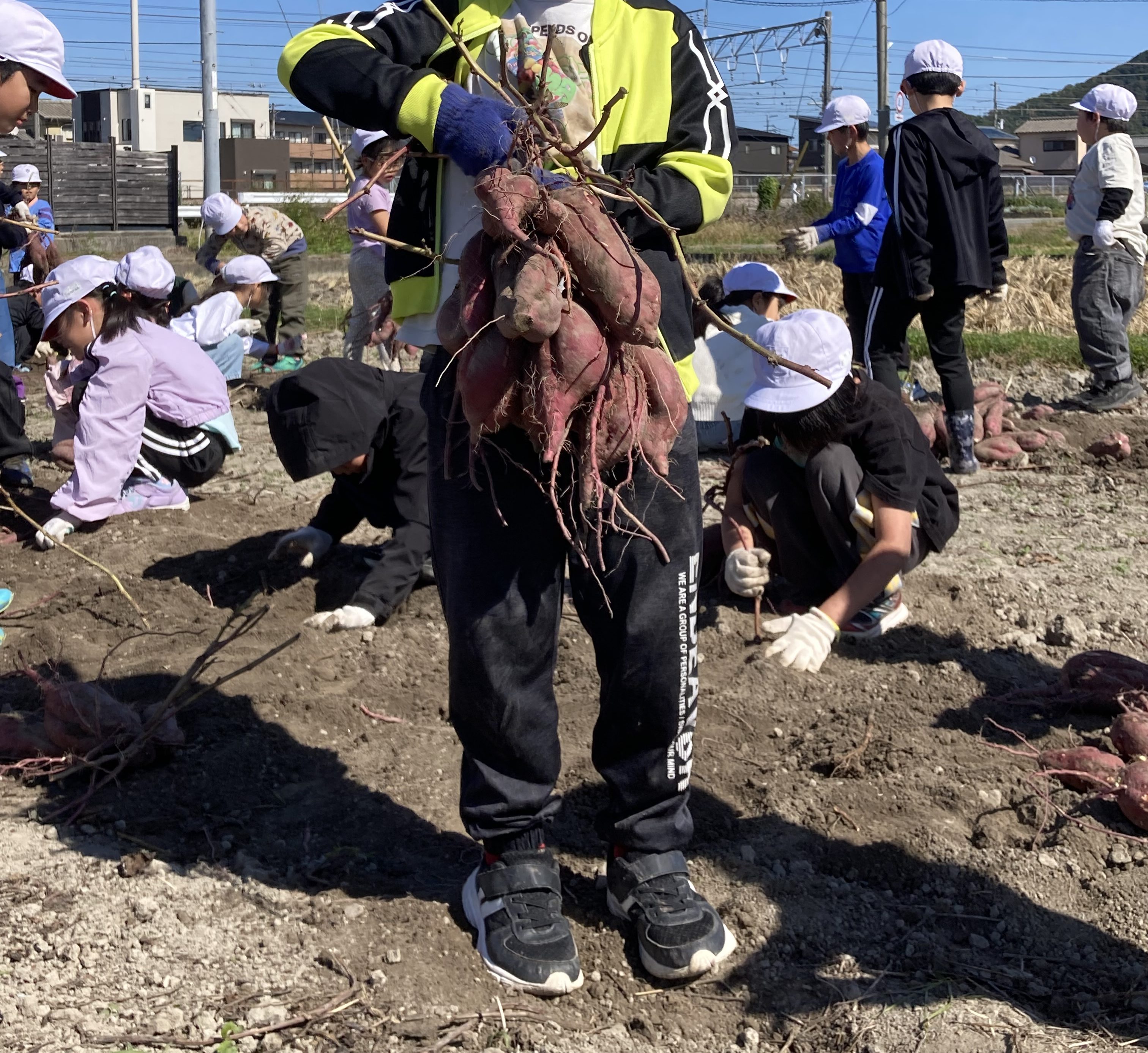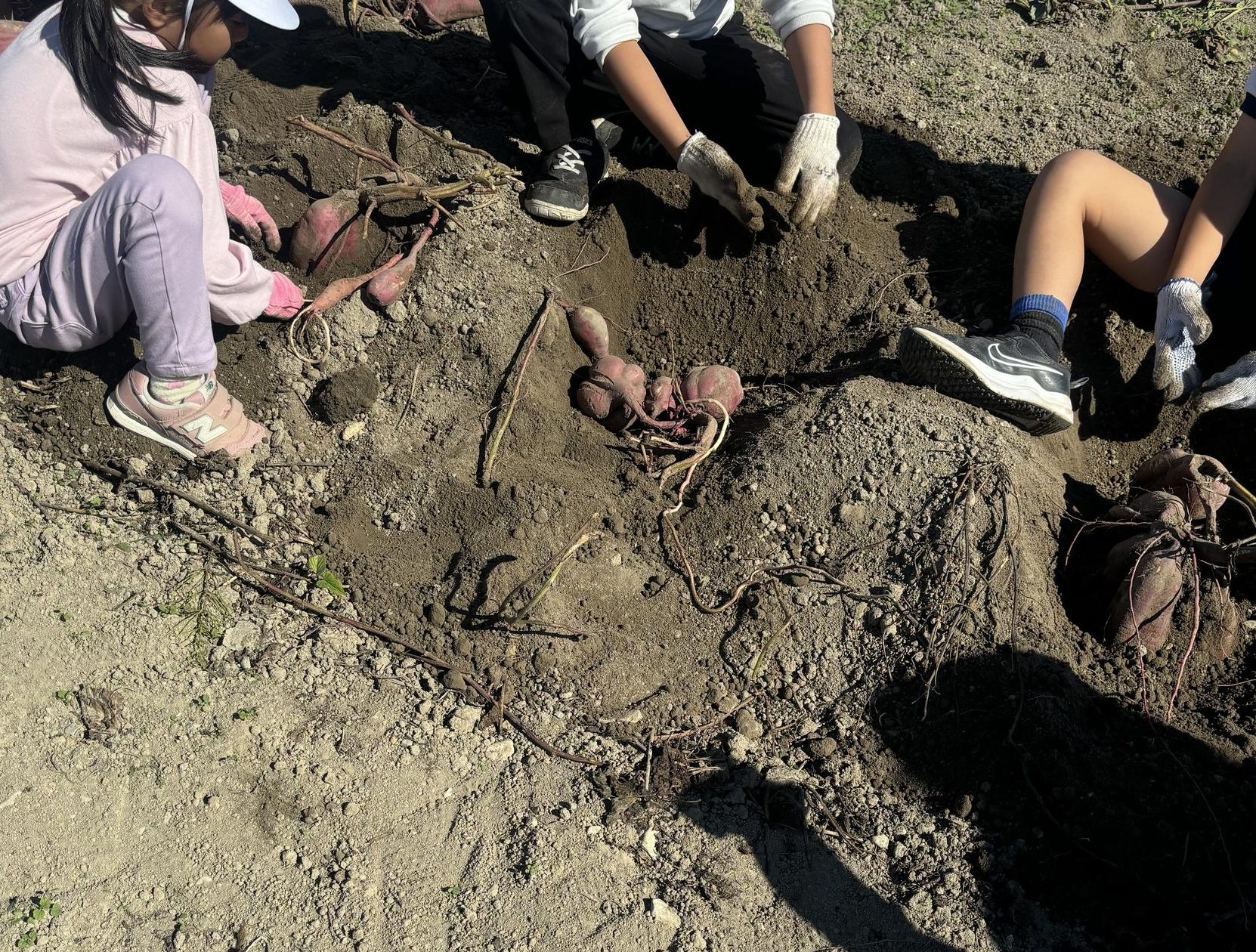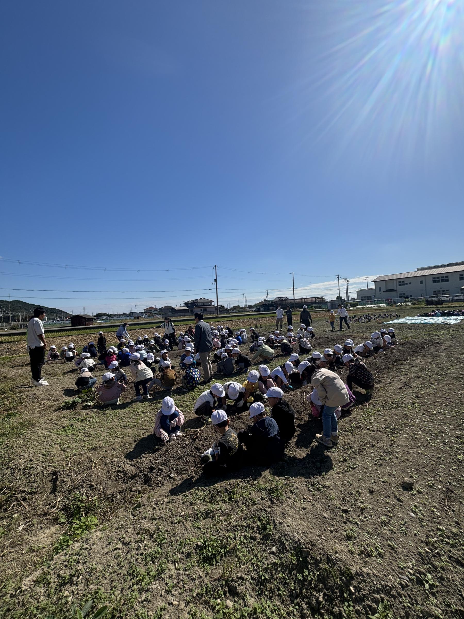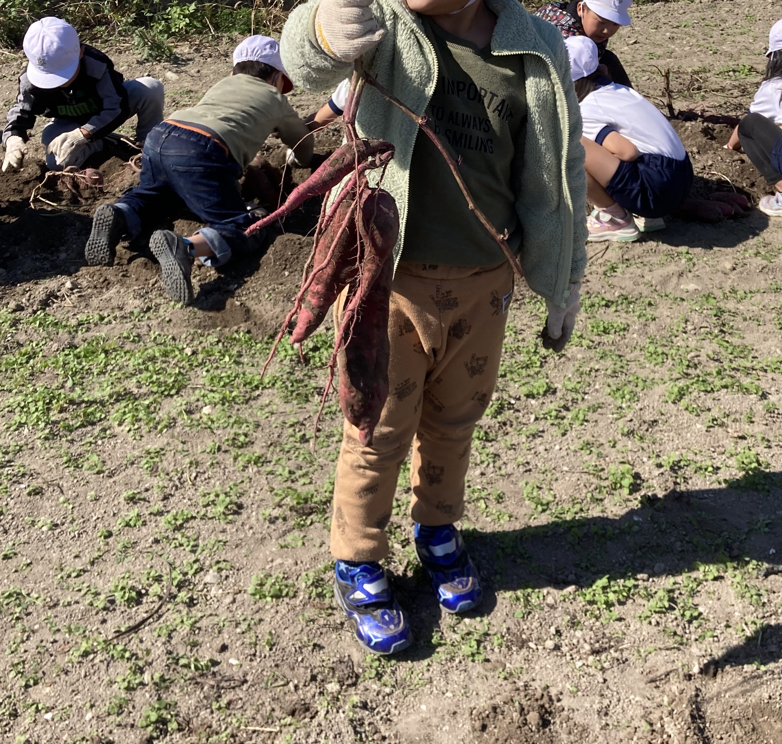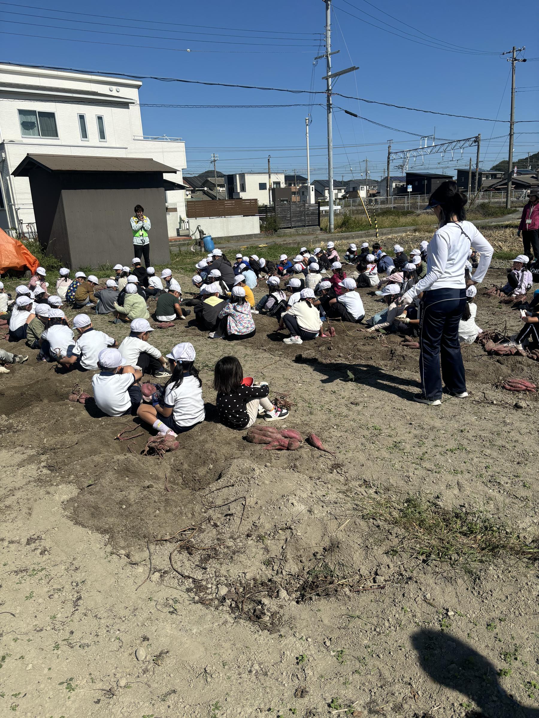 小学校いも掘りNEW/ 絆 勝原小学校1年生が、さつまいも掘りに来てくれました。秋祭りの冷え込みで心配していましたが、当日は行楽日和。春、みんなで畑に植えた苗が立派に育ち、ドキドキの収穫体験です♩ 児童は総勢100余名、畑の真ん中で行儀よく整列。  担当職員の挨拶と説明の後、 「いまから掘りまーす」  軍手🧤をはめて手でホリホリ お芋の肌を傷つけないように、優し~くナデナデ 「先生!こっち手伝ってー」と声が聞こえてきます(*^^*)♪  でました! よかった~🍠みんな、一株三つ以上は大きなお芋がついています。  今年は300個以上のおいもが掘れました!豊作です。 みんなのお土産もできて、担当職員ほっと一安心。 楽しんでくれたようで良かったよ~ 児童のみなさんは、芋掘りの後、敷地内のグランドでお弁当を広げてプチ遠足。散歩に出た利用者さんが「おかずな~に?」って尋ねたら、「もうたべちゃったー!」って。ざんね~ん ^^) _旦~~  また来年もお待ちしています🍠✨ 一緒に芋掘りしましょうね