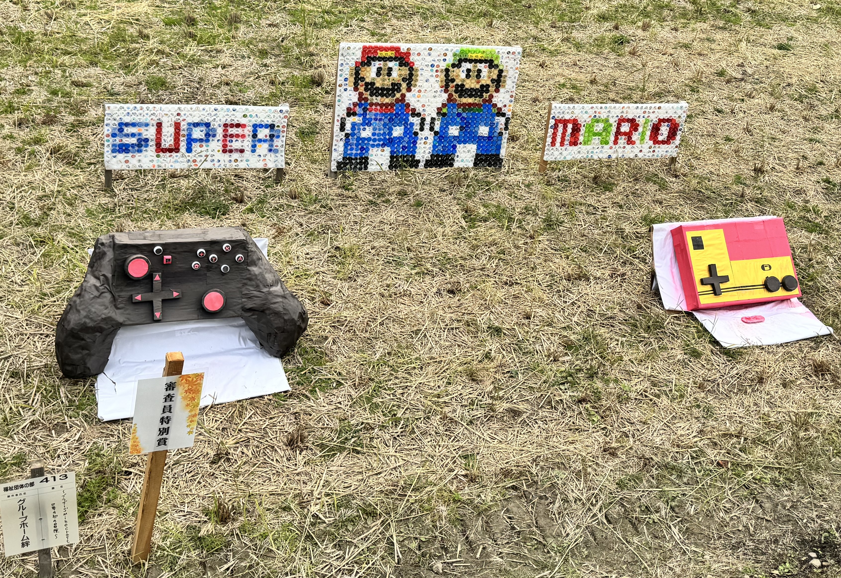 今年の作品は、ペットボトルキャップでモザイクアートのかがしです。青色を集めるため、青キャップの飲み物を飲み干したこともありました。飾られている姿に感動・・!手前は、昭和世代に懐かしいスーパーファミコンのコントローラー!平成後期世代にはエモいswitchのコントローラーも!!